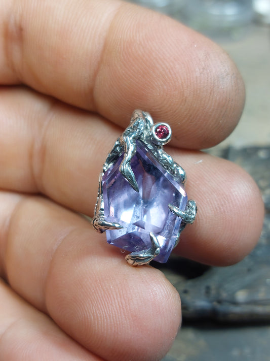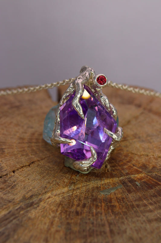 "Riflessi" ciondolo con Ametista tagliata a Mano e Zaffiro Rosso