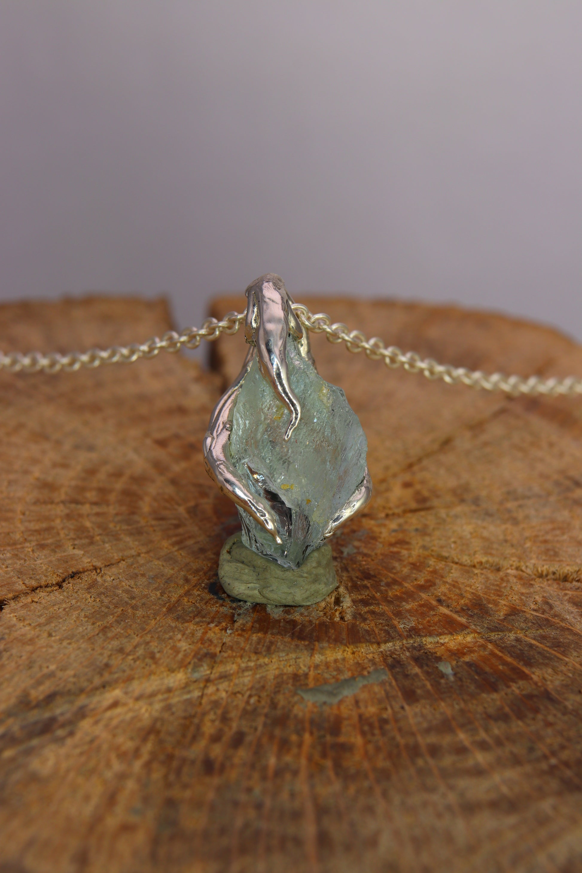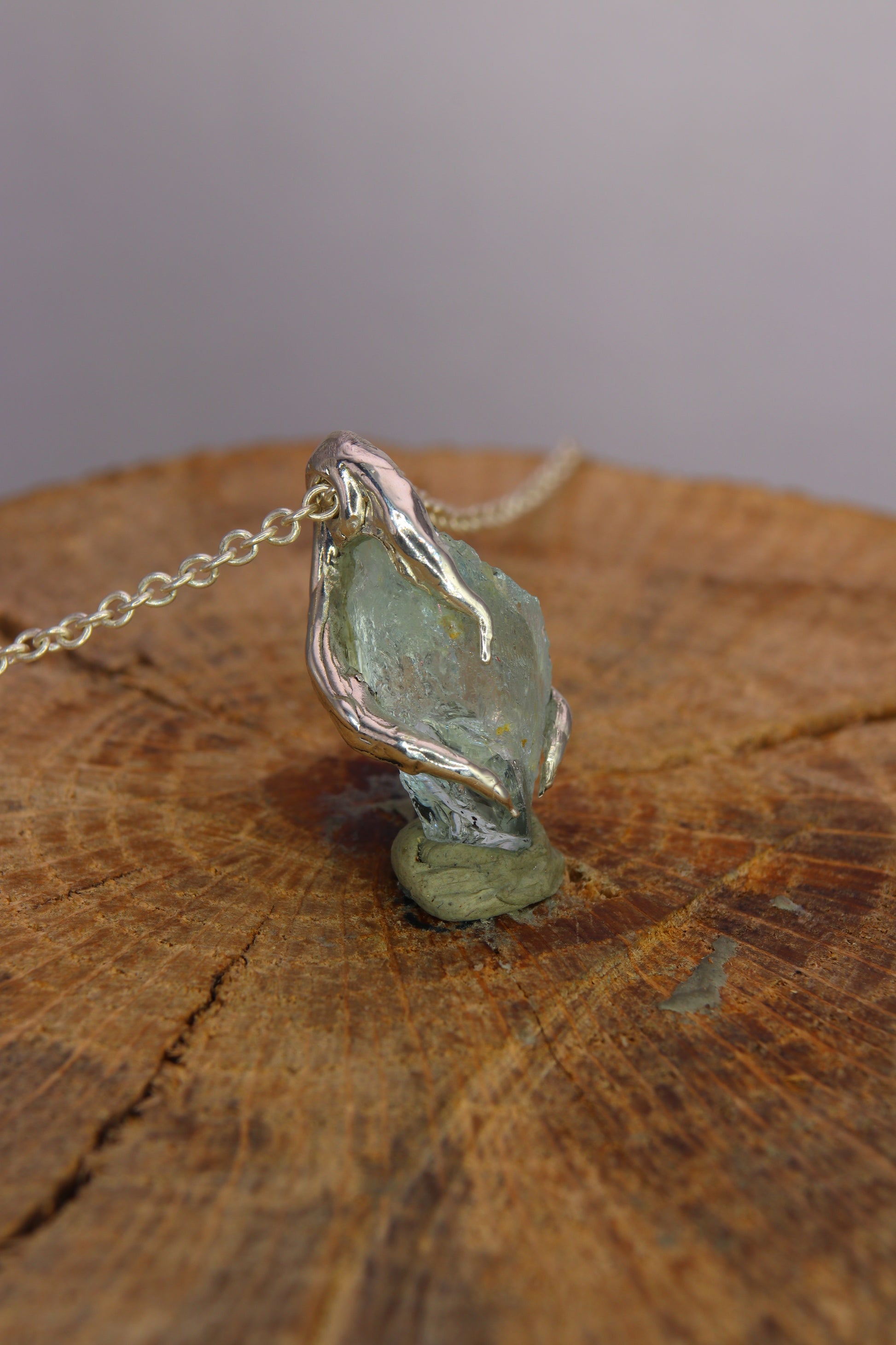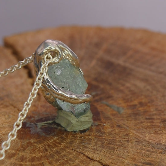 The pendant features a raw aquamarine that has been "polished" respecting its shape, there are no facets or geometric shapes, it is as if it were a small precious pebble set in a frame of silver roots.