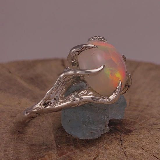 L’opale è trattenuto da 6 griffe organiche, come piccole radici che salgono e lo afferrano, lasciando però la gemma libera di prendere tutta la luce possibile.