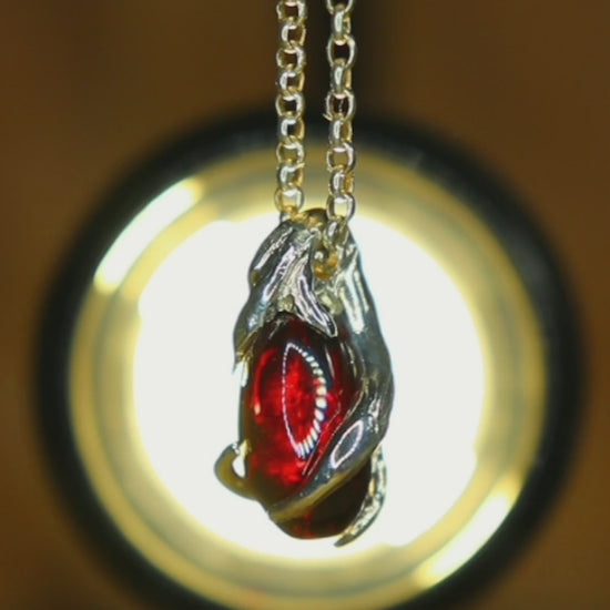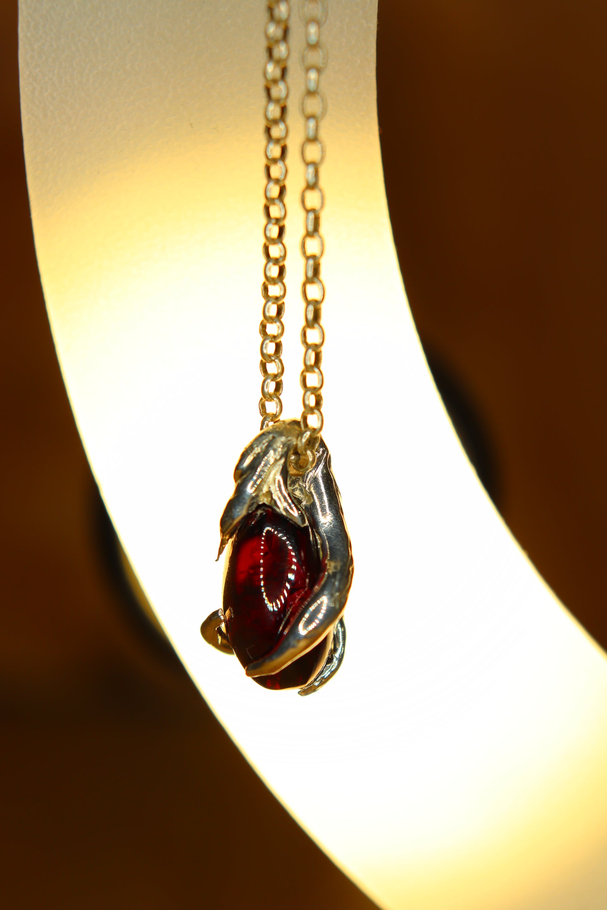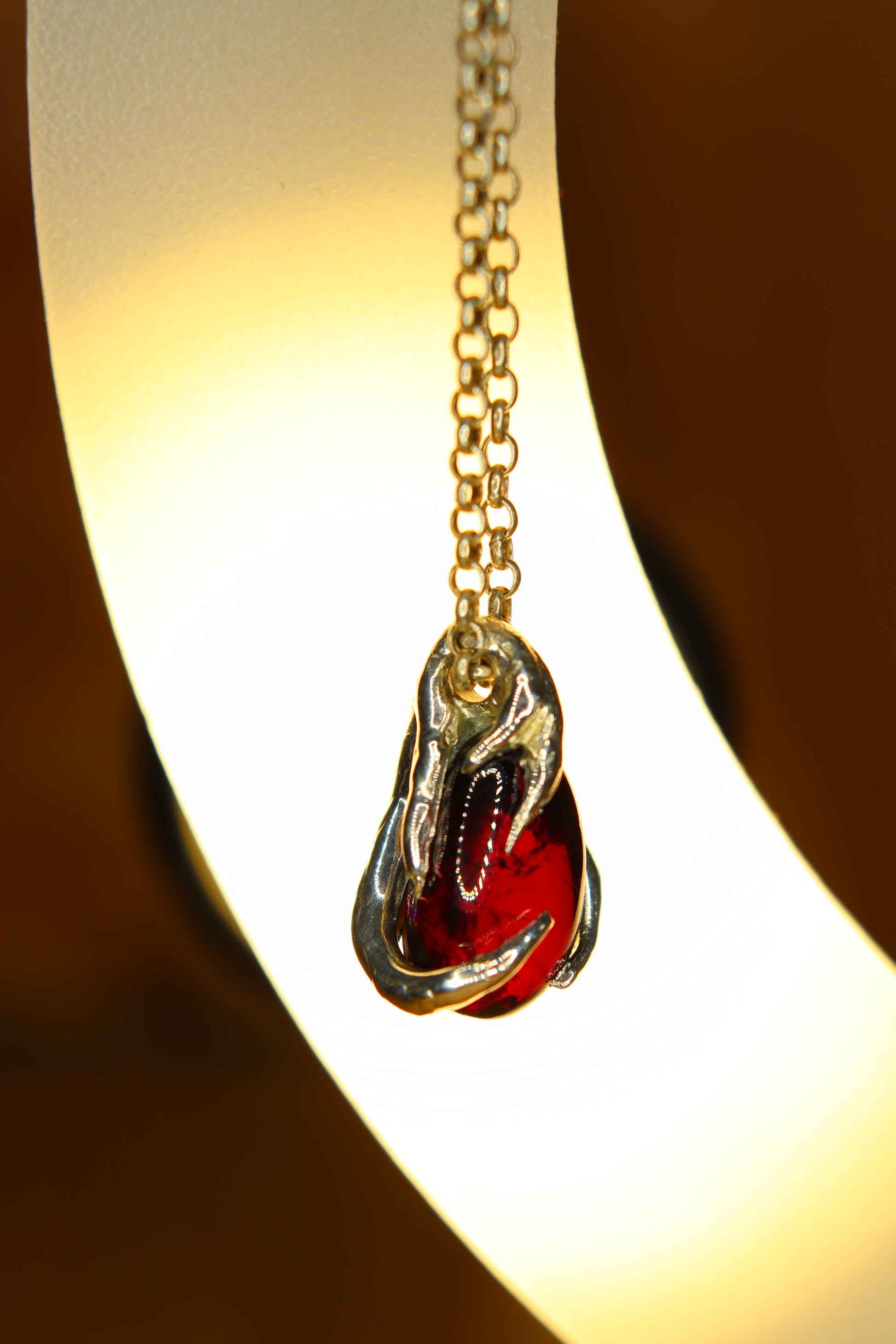 Il protagonista è un granato piropo dal colore rosso intenso, trasparente e luminoso, capace di mostrare una notevole profondità visiva nonostante le dimensioni contenute. Il contrasto tra la superficie viva e organica dell’argento e la trasparenza calda della pietra rende questo ciondolo particolarmente espressivo.