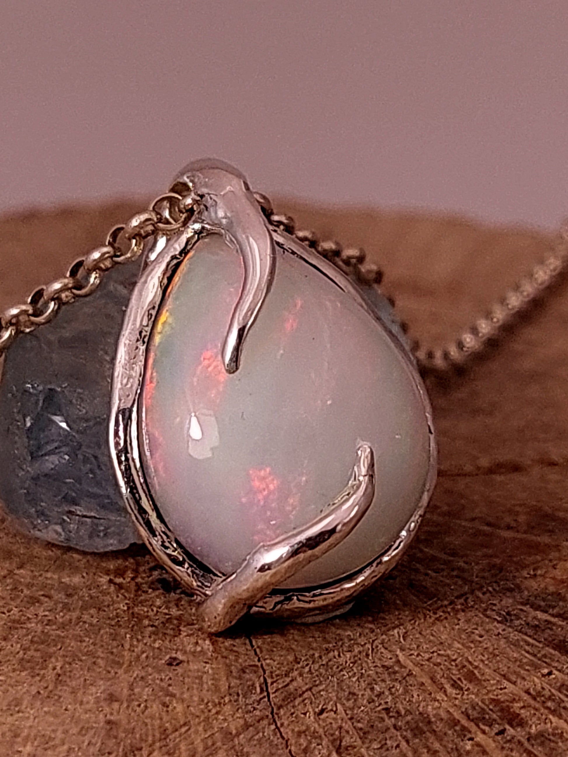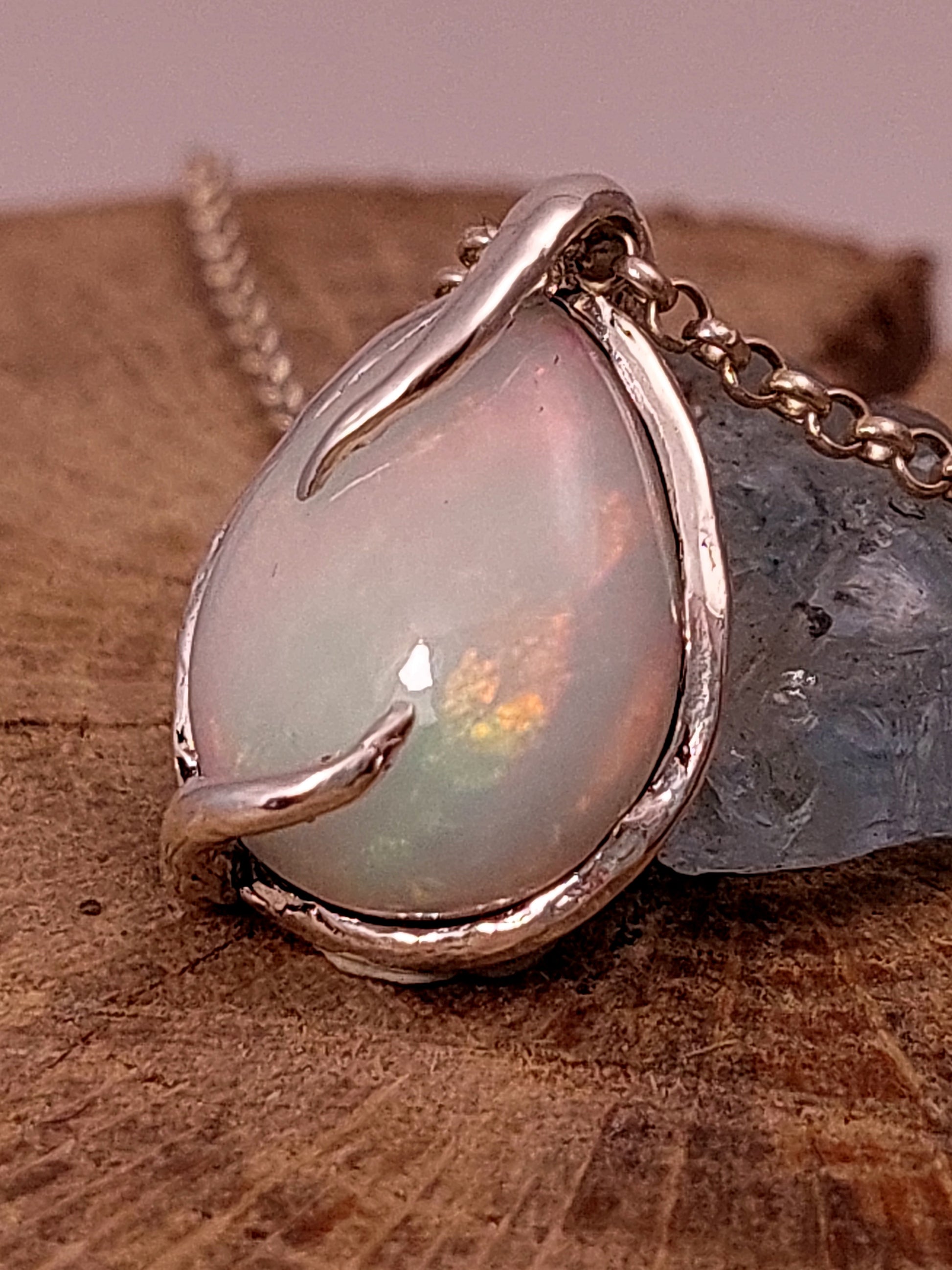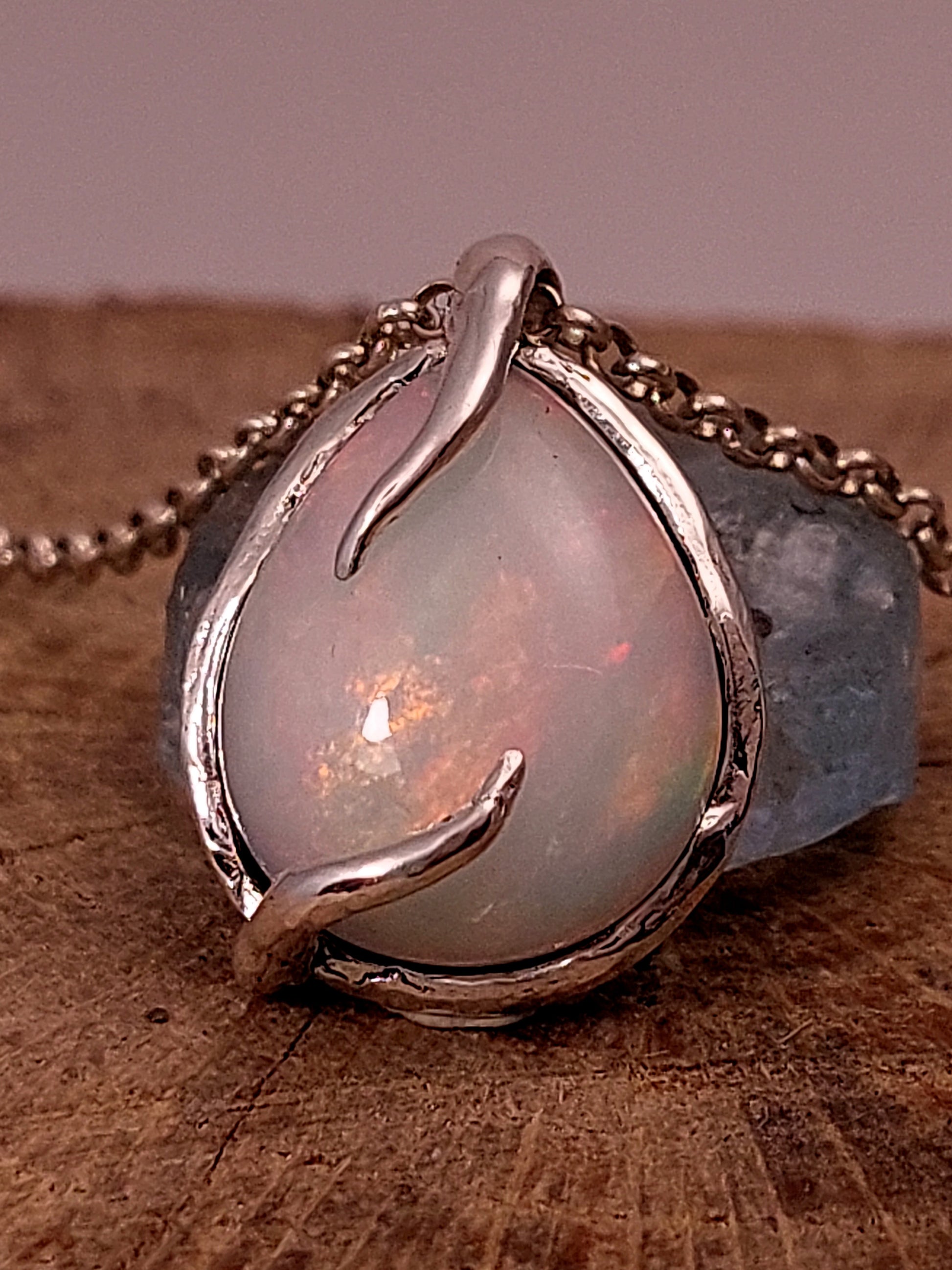 Opale etiope incastonato in una montatura organica, fatta di radici d’argento che sembrano crescere intorno alla pietra per trattenerla senza soffocarla.