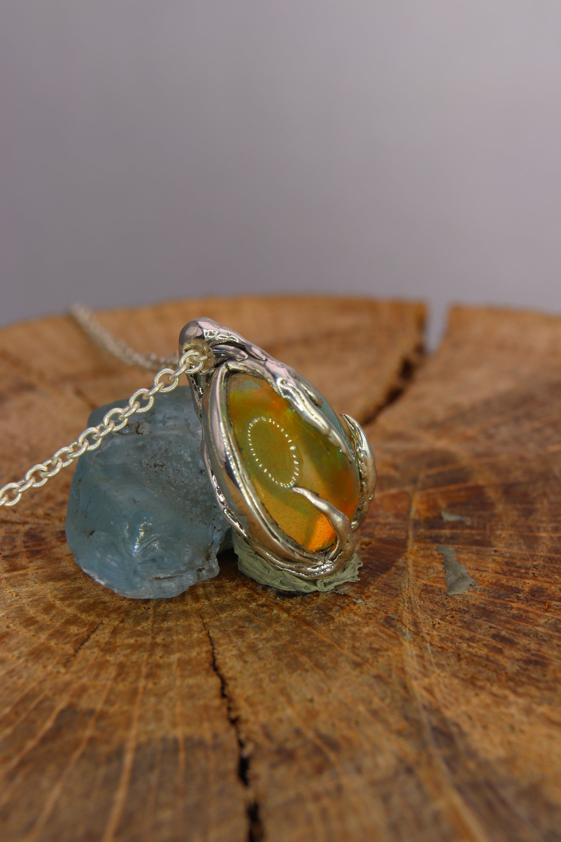 Un ciondolo con un opale color miele, caldo e profondo, che sotto la luce si accende di riflessi verdi, gialli e rossi.