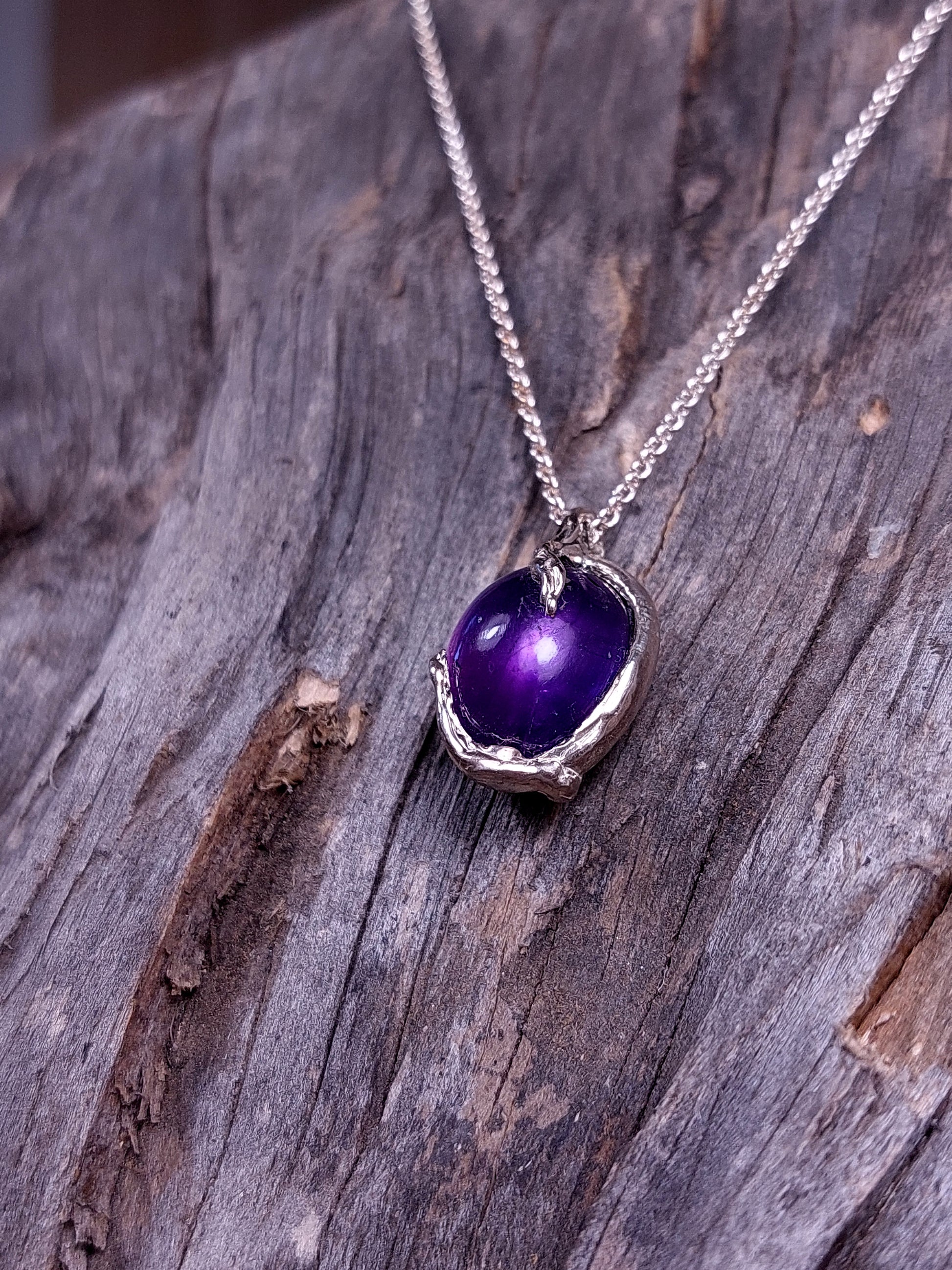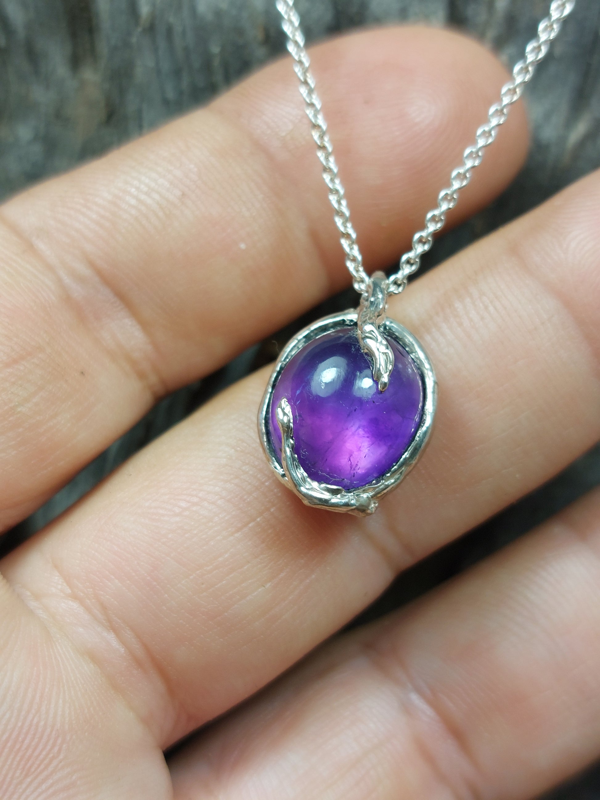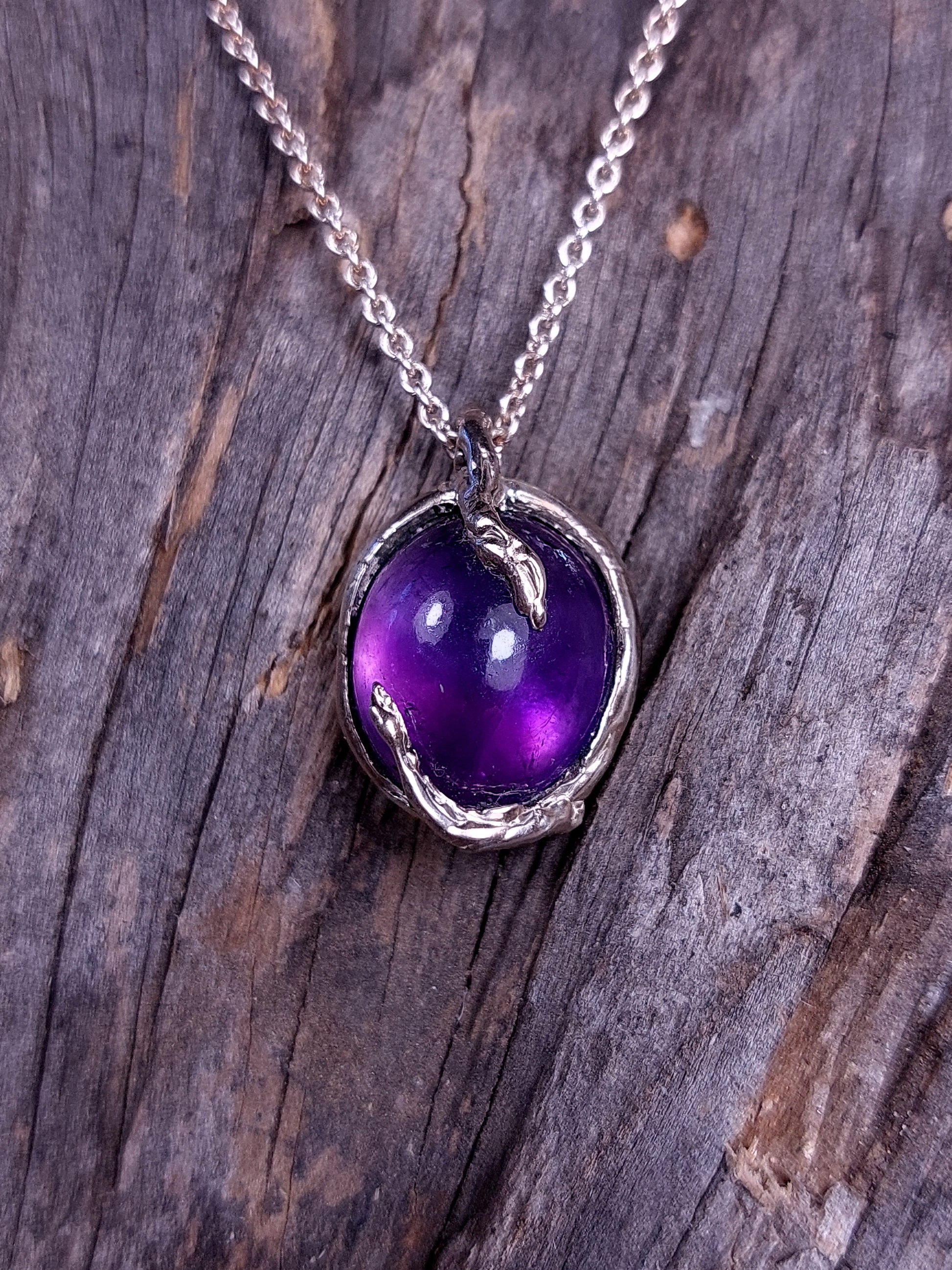 Un cabochon di Ametista, dalle tonalità viola profonde e luminose, è custodito in un castone chiuso da cui si sviluppano radici e viticci d’argento. Queste forme organiche crescono attorno alla pietra, trasformandosi in griffe che la trattengono con forza e delicatezza allo stesso tempo.
