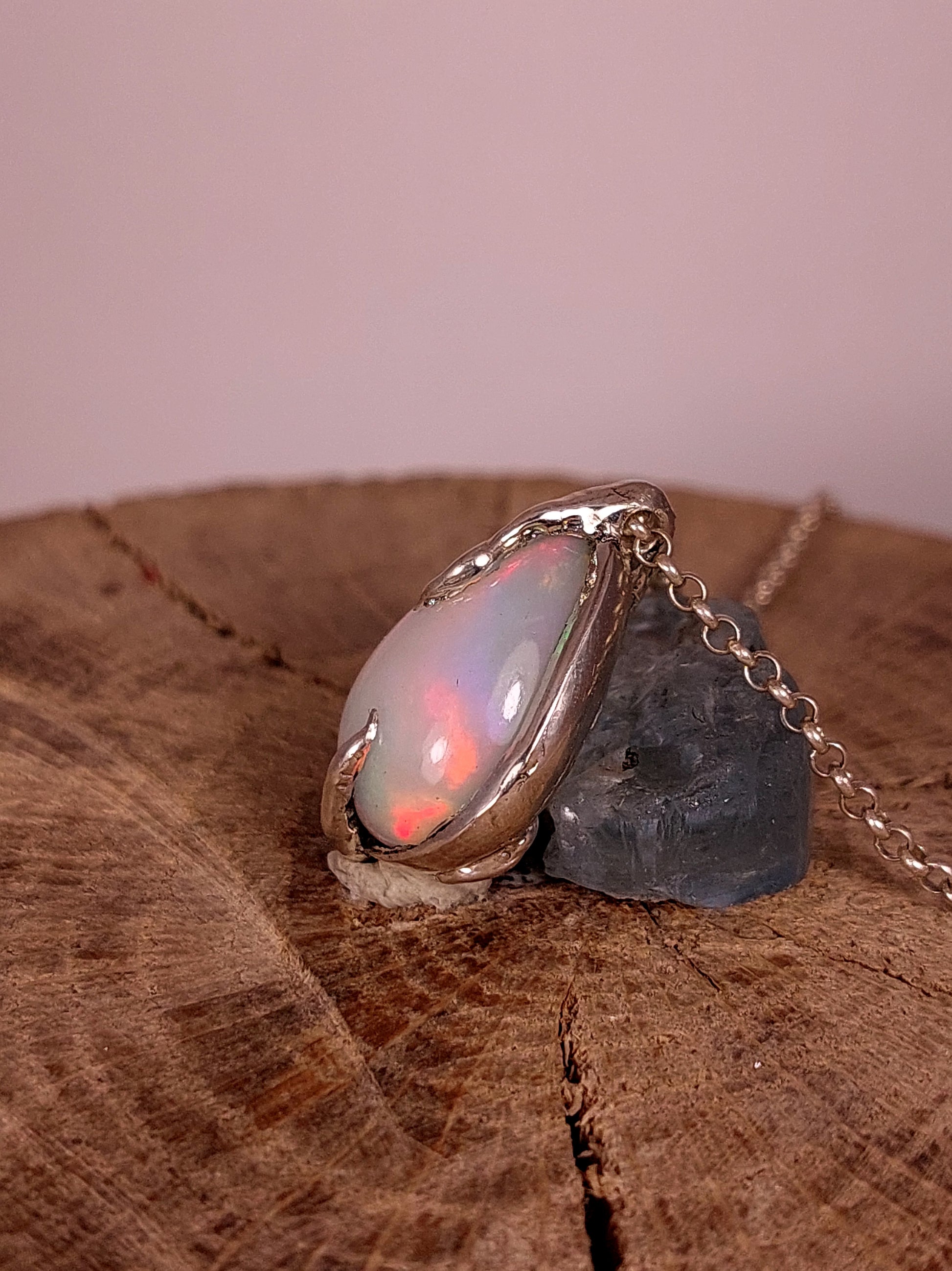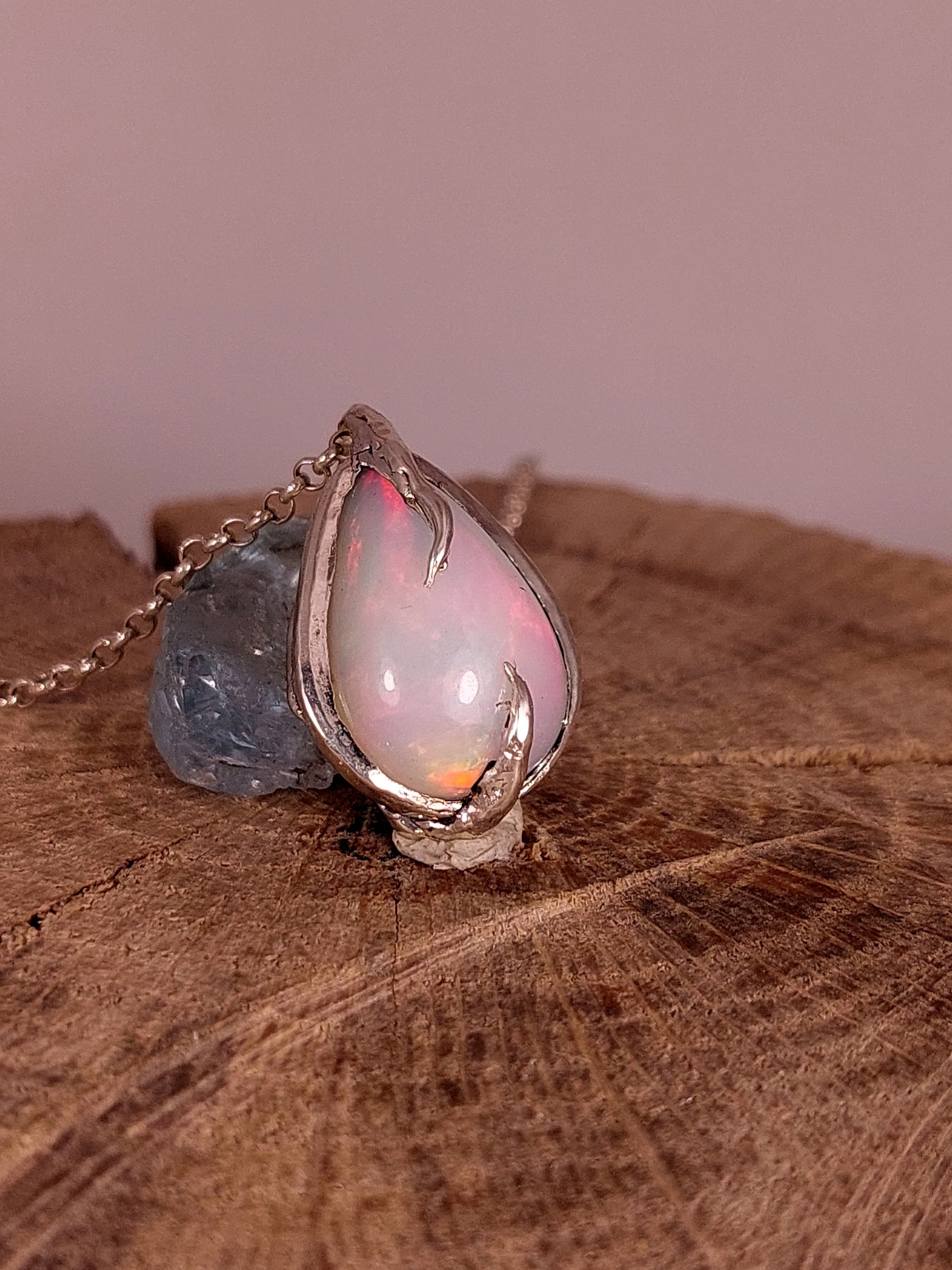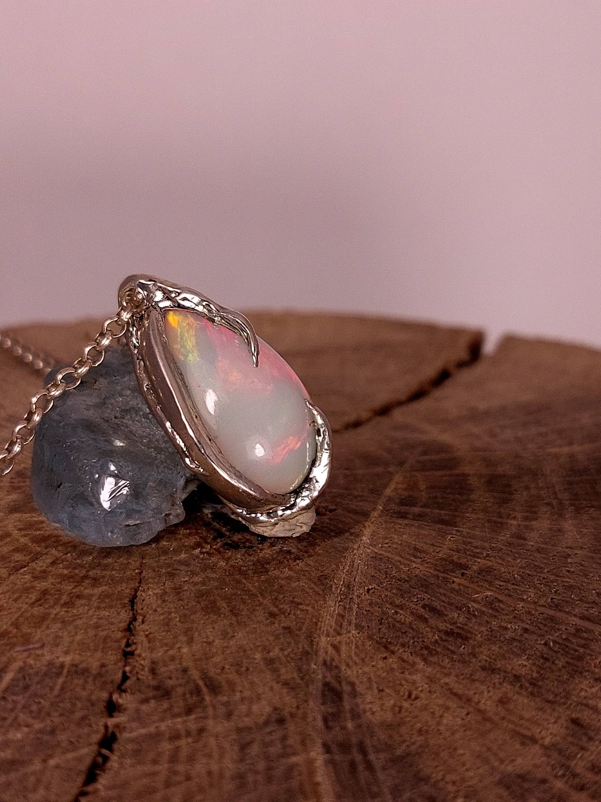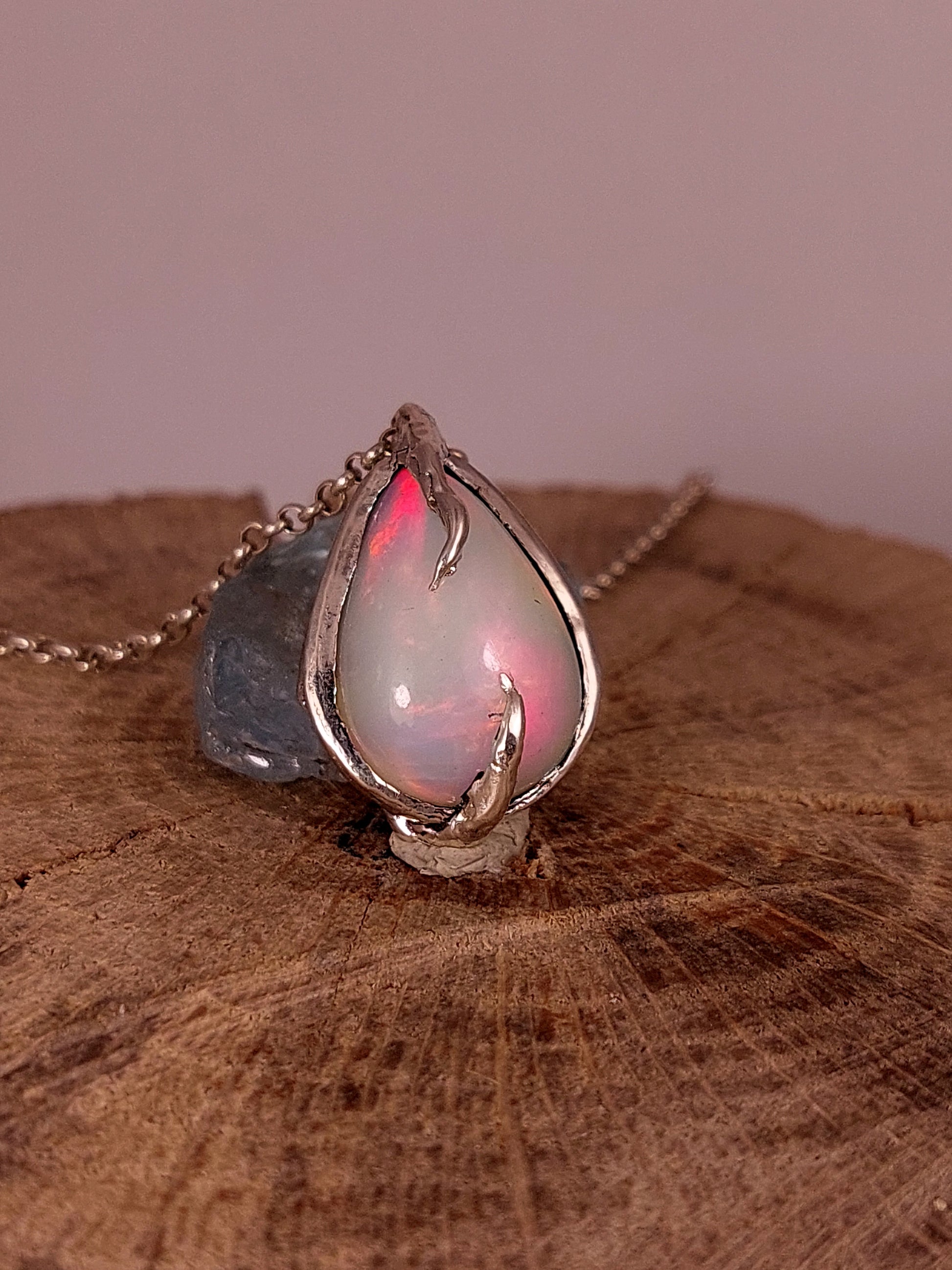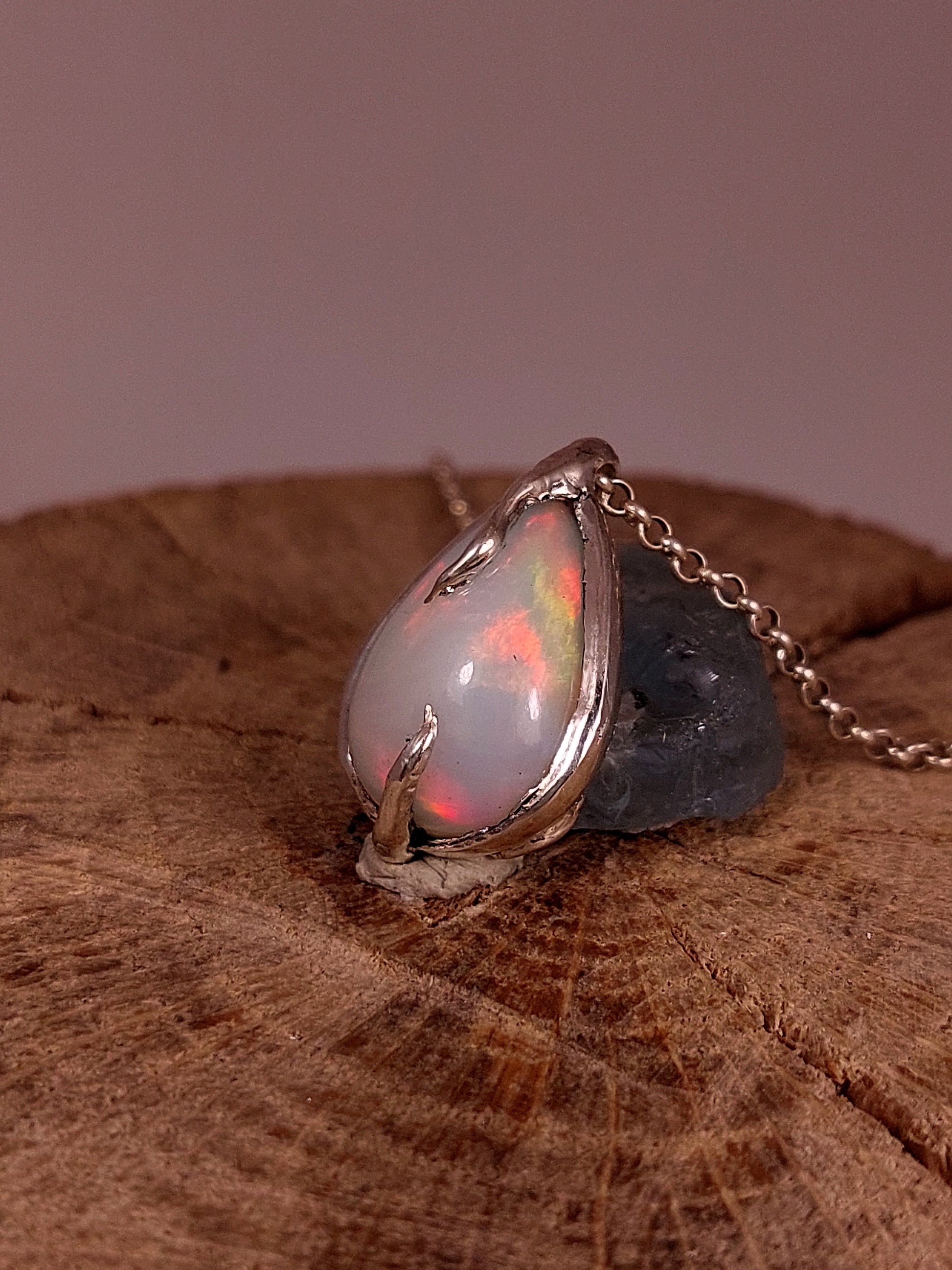 Opale etiope incastonato in una montatura organica, fatta di radici d’argento che sembrano crescere intorno alla pietra per trattenerla senza soffocarla.