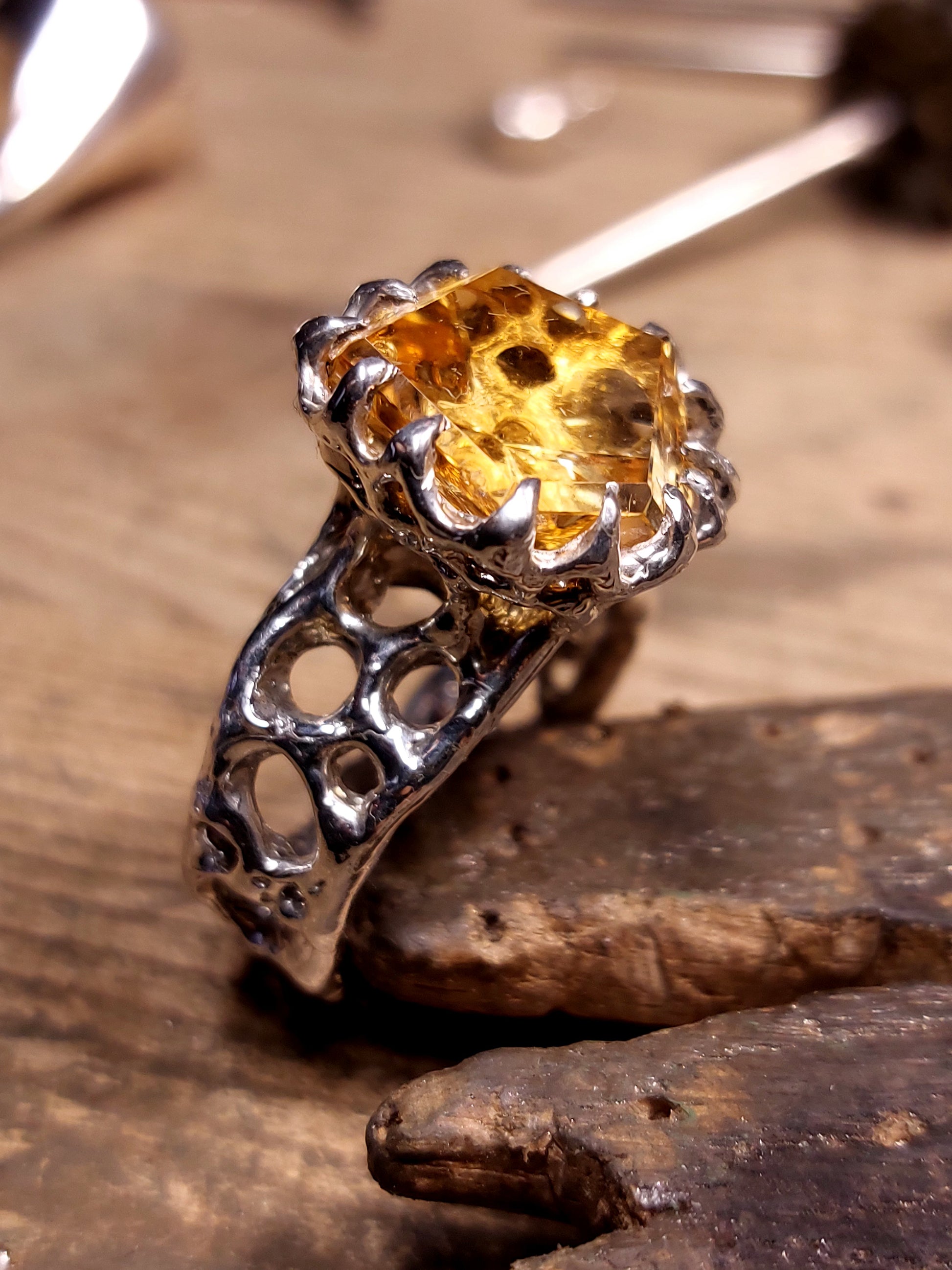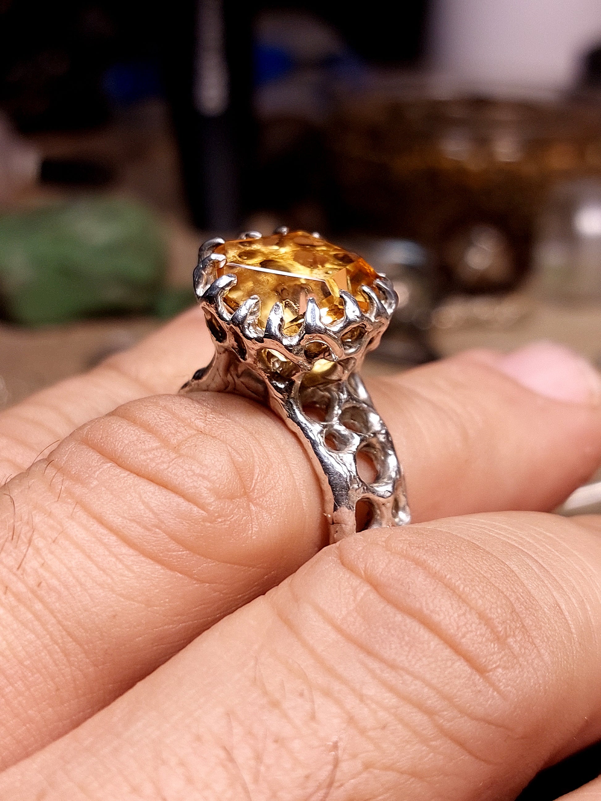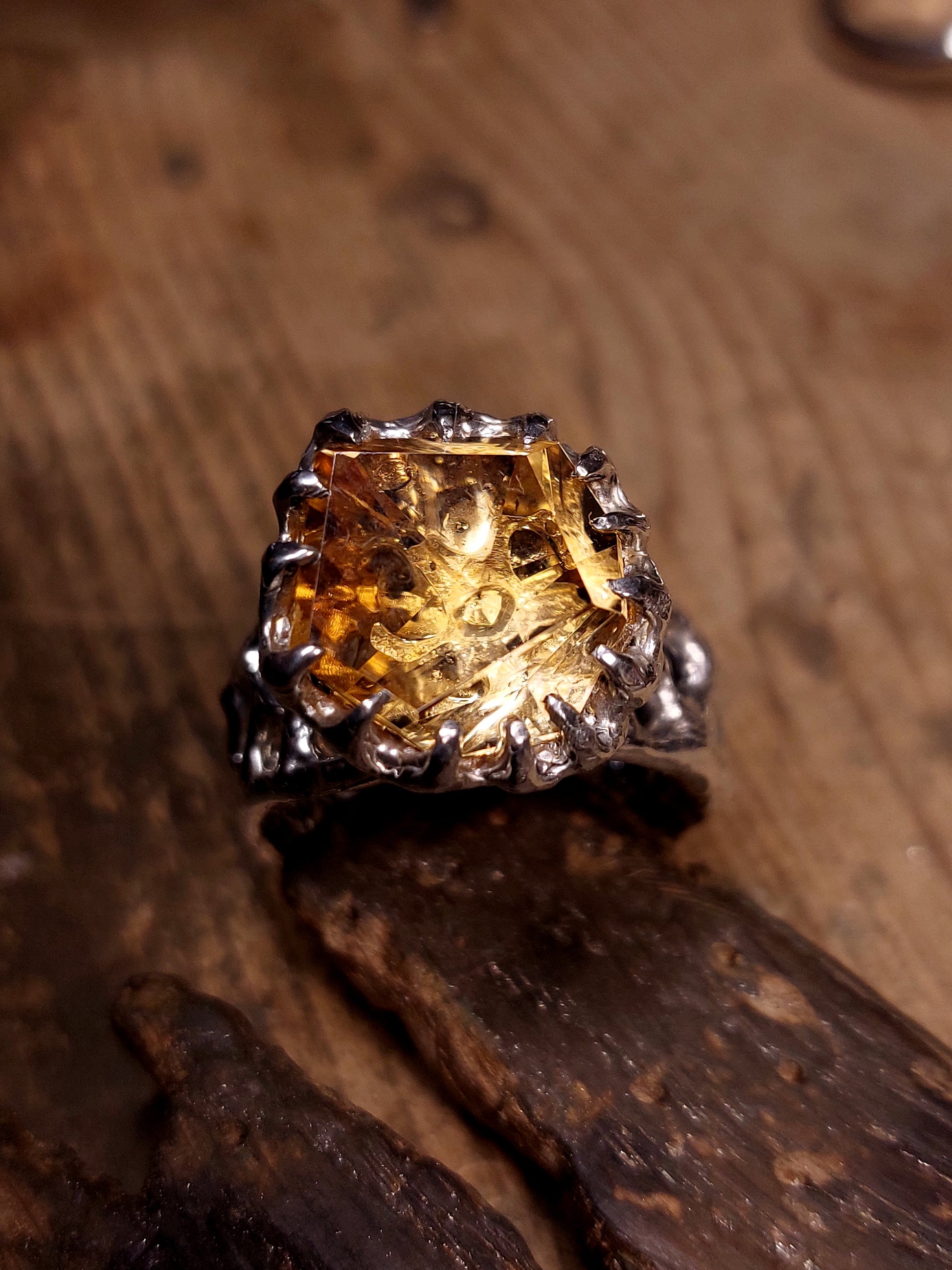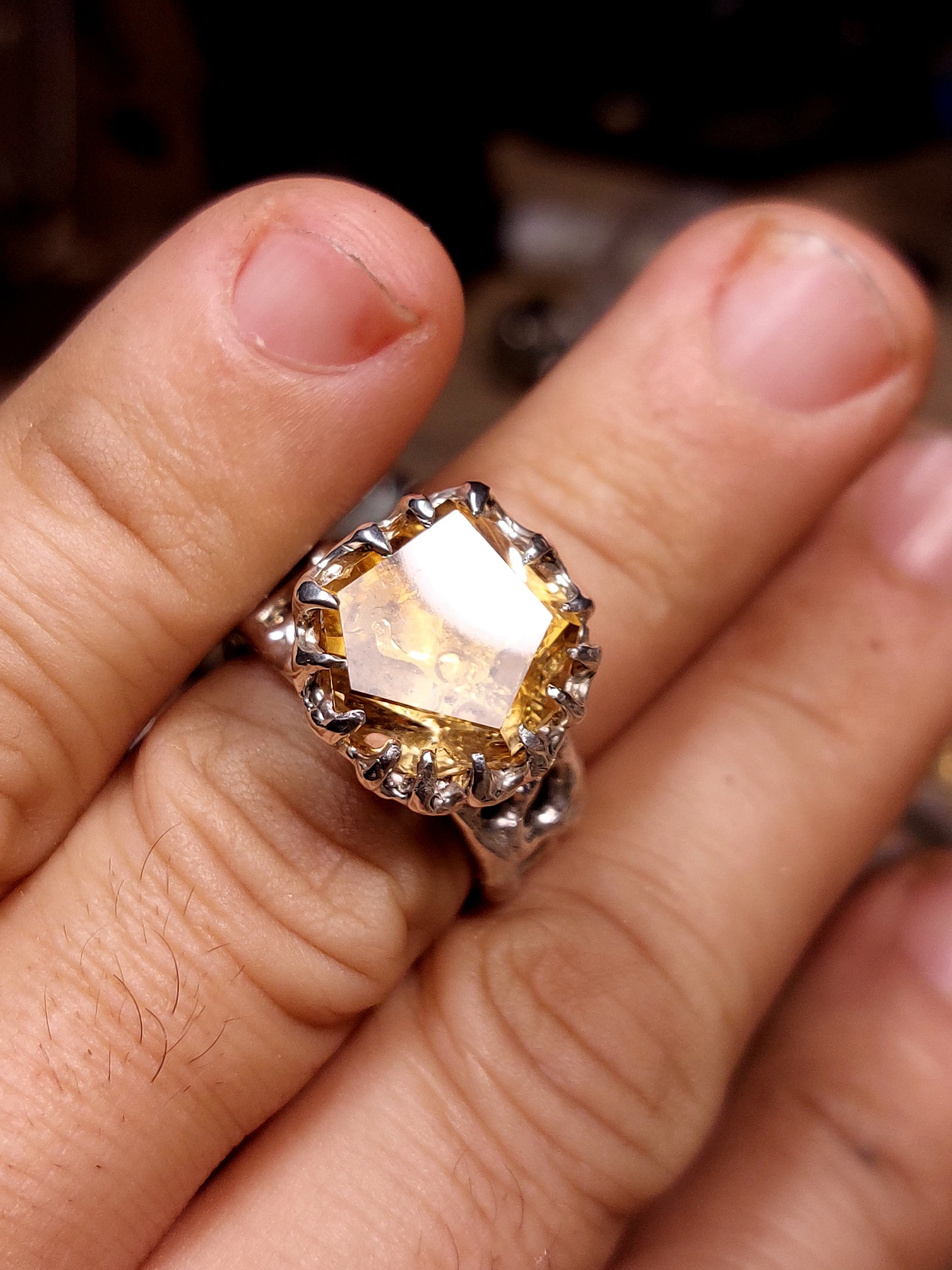 Al centro questa volta c’è un quarzo citrino, anche lui tagliato a mano partendo dal grezzo.