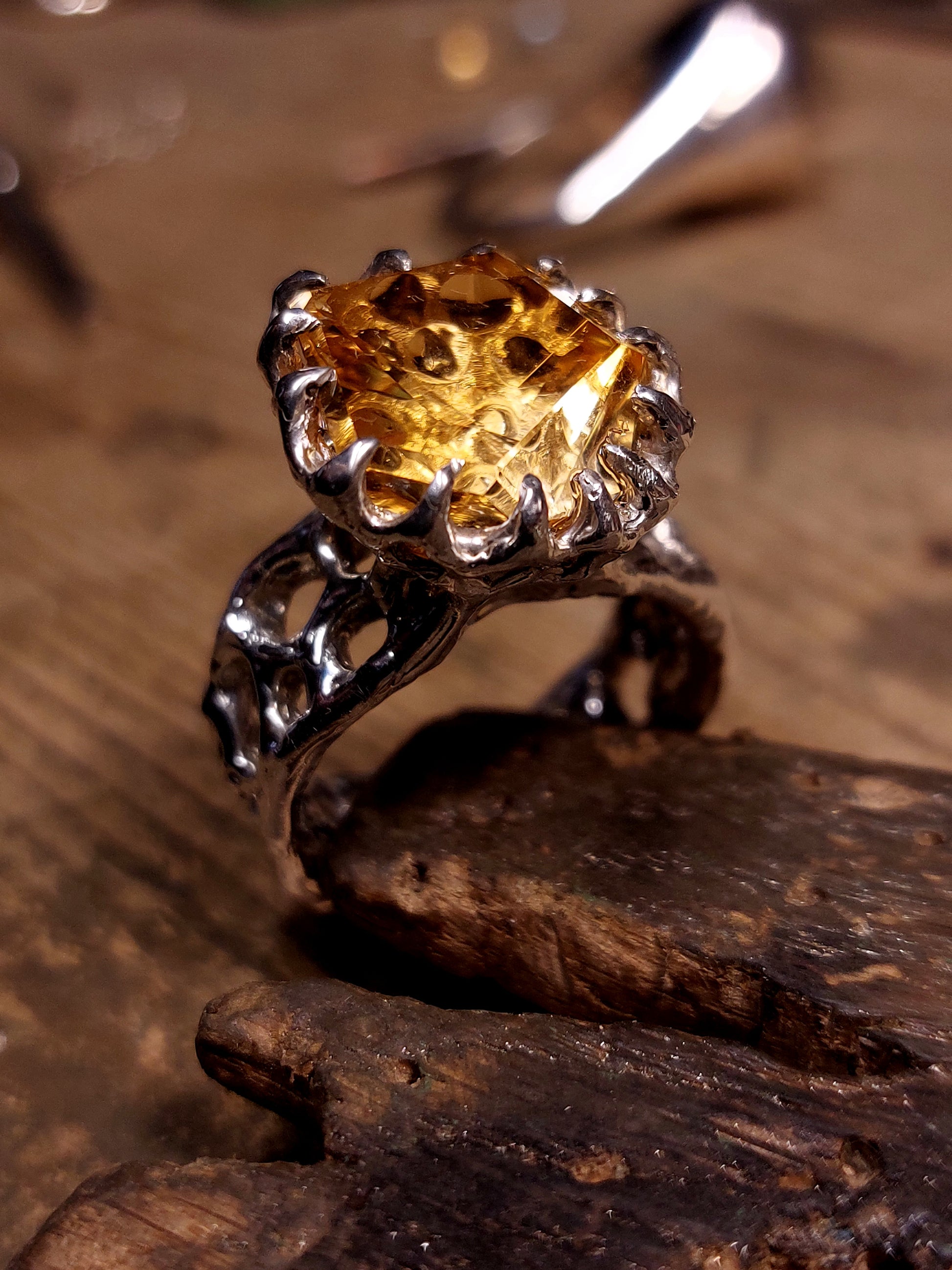 Questo anello è realizzato interamente a mano, è unico, creato appositamente attorno alla gemma che ospita, non ne esistono copie. Se vuoi chiedermi informazioni per una creazione simile a misura per te, anche in un metallo diverso, bagnata in oro o con una gemma diversa, CONTATTAMI