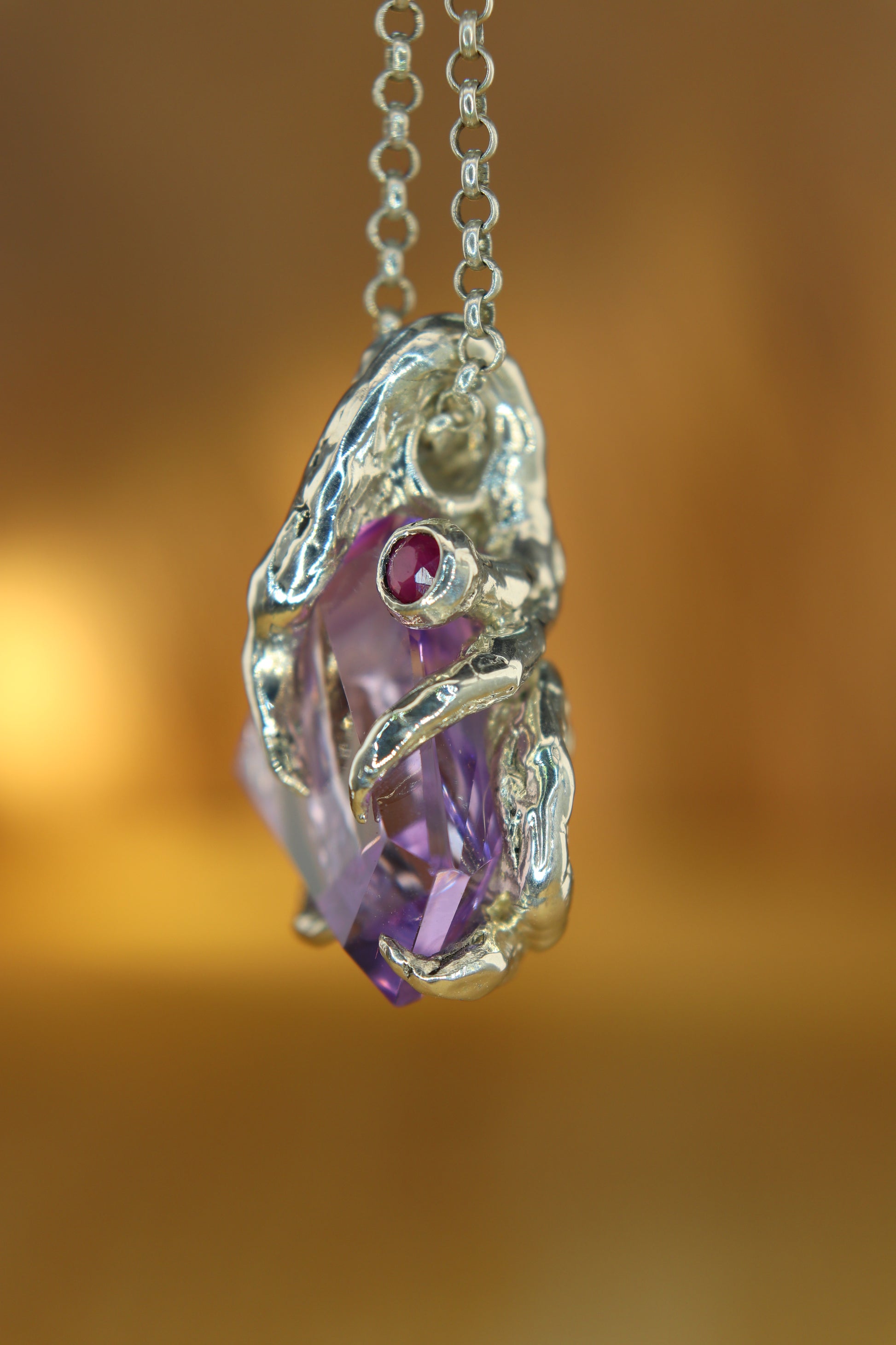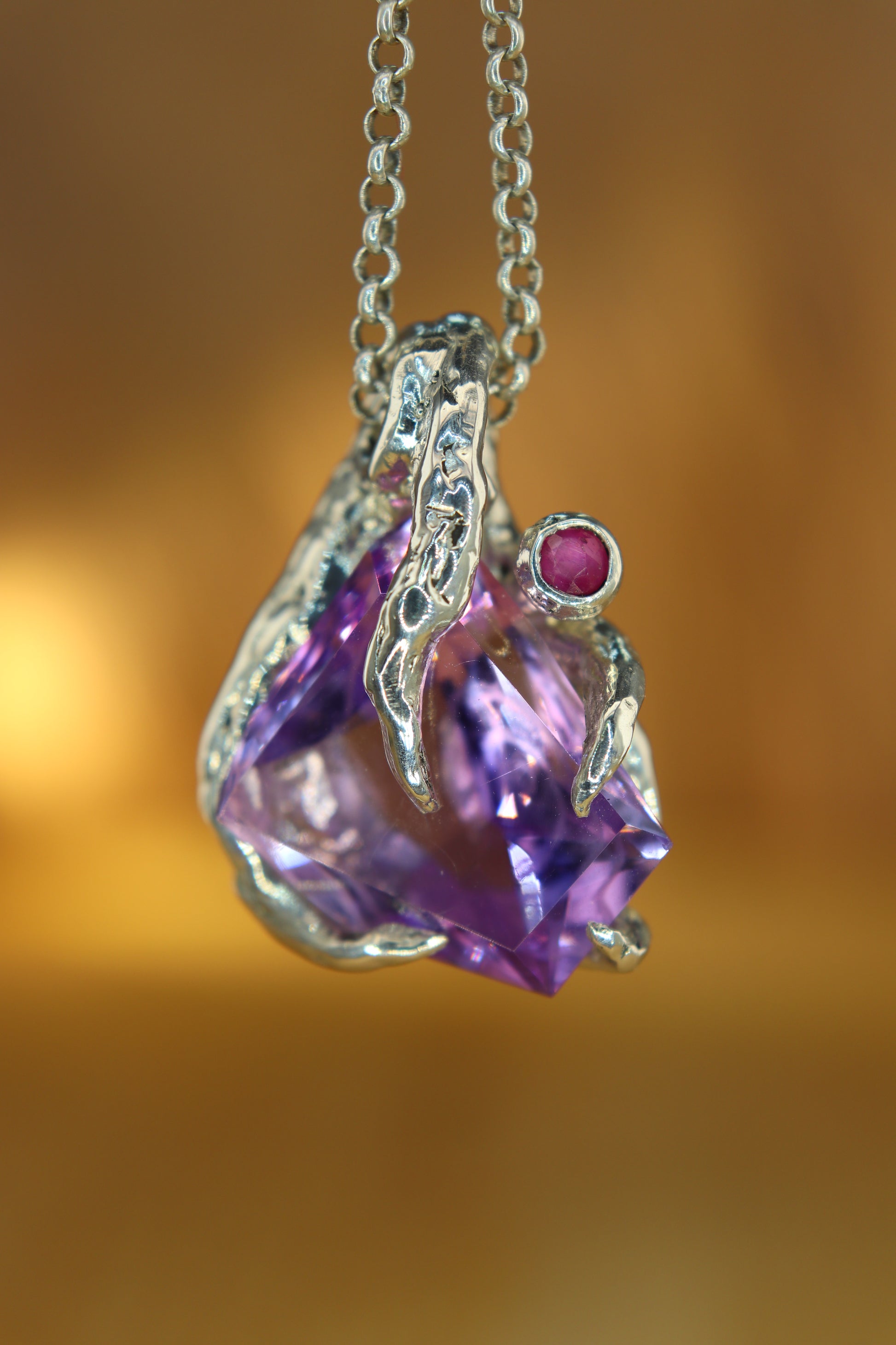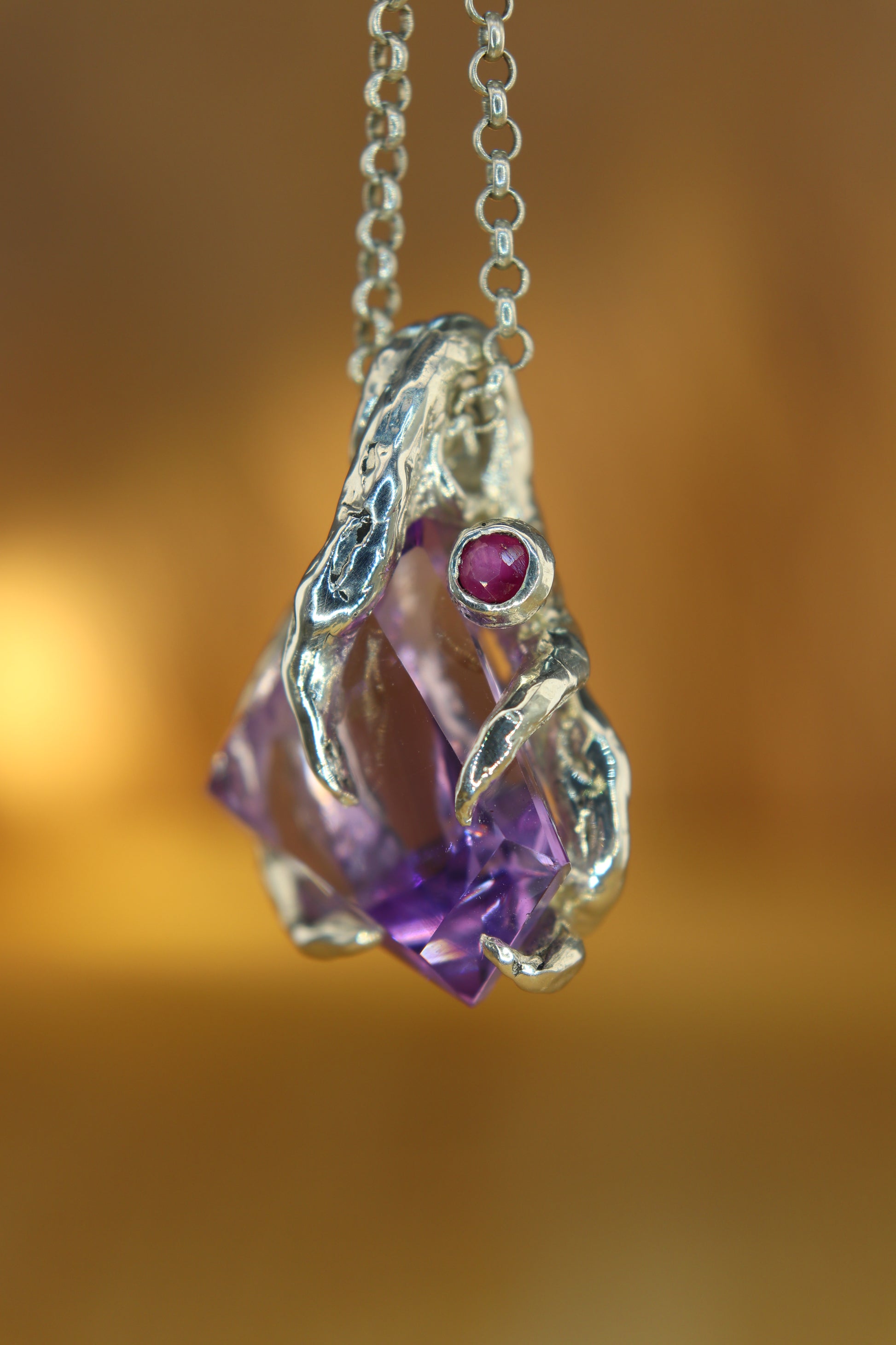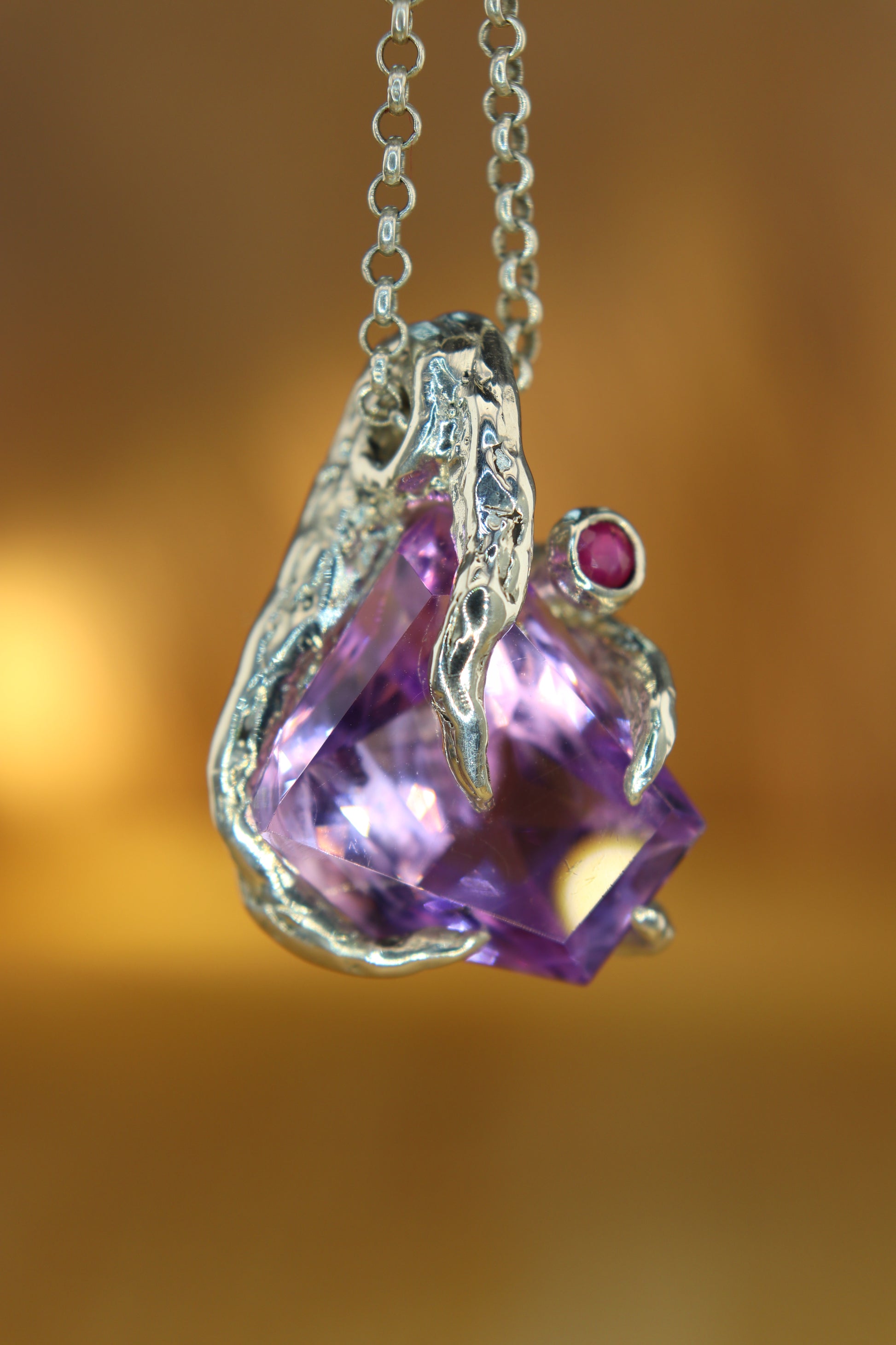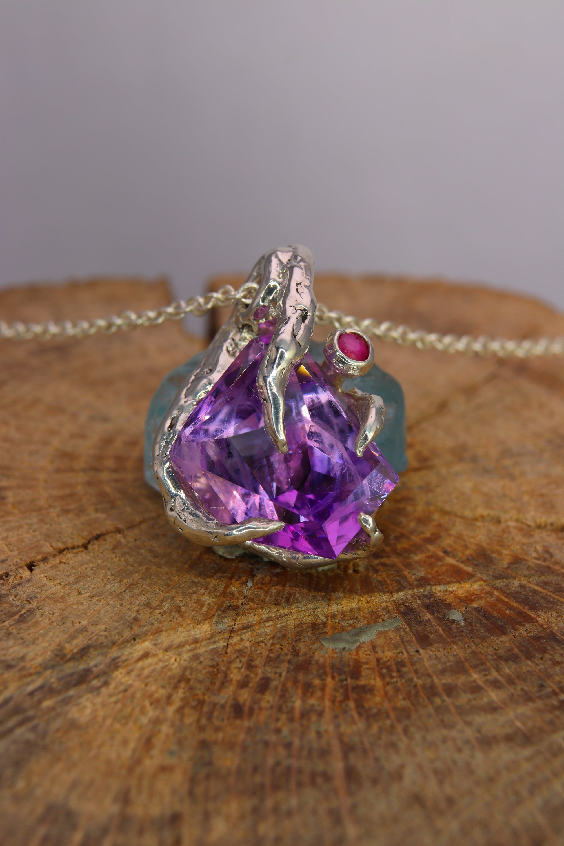 "Riflessi" ciondolo con Ametista tagliata a Mano e Rubino