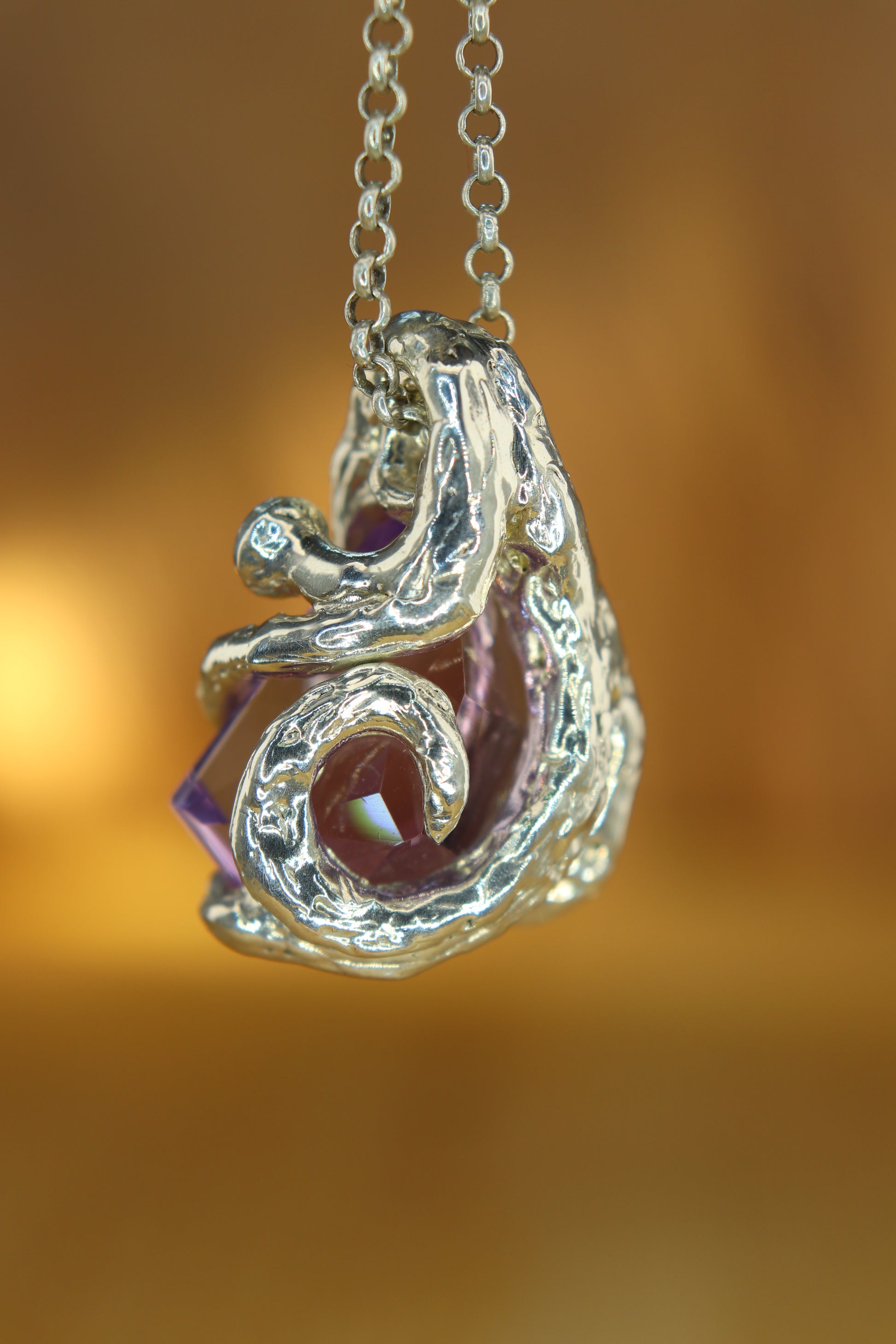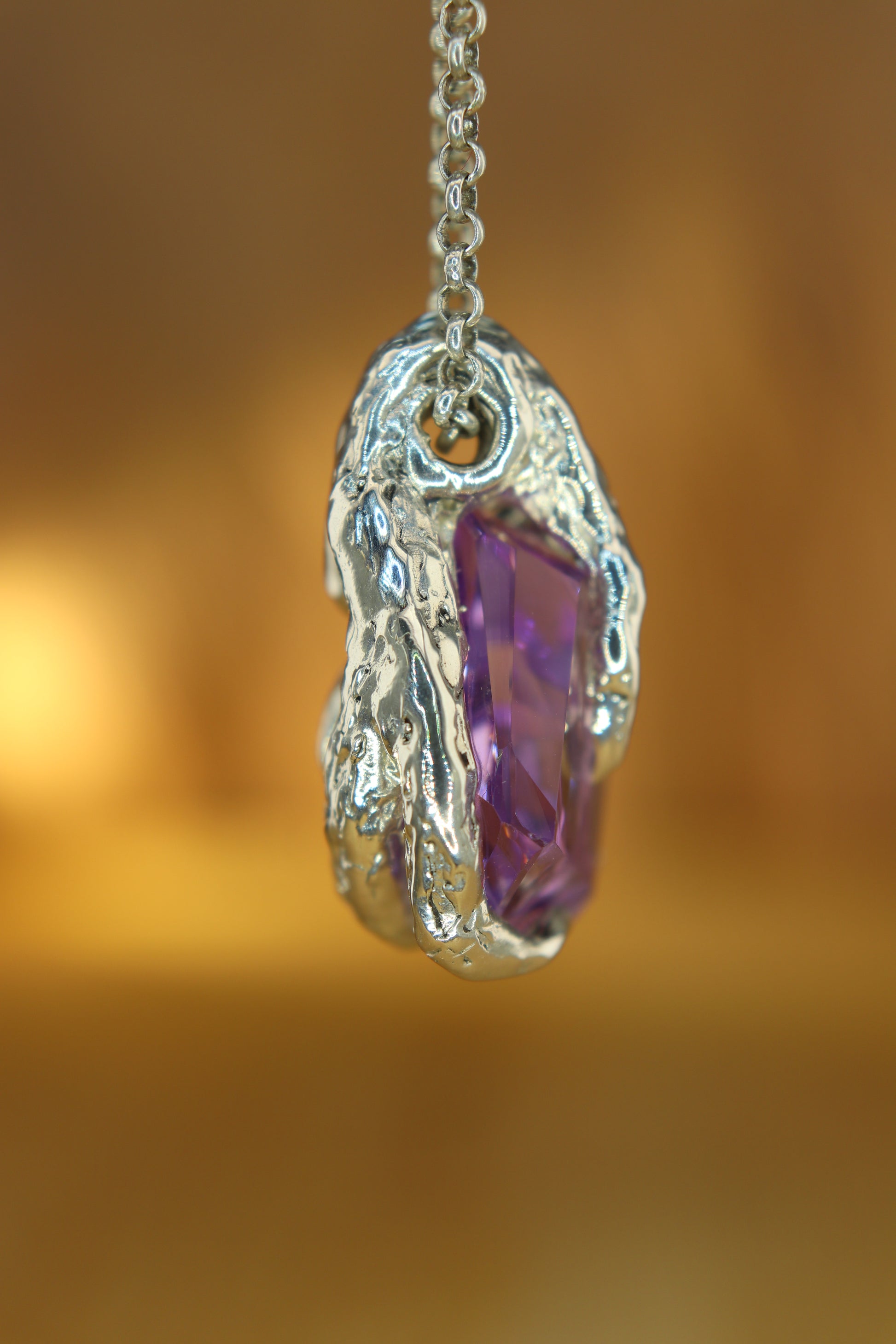 Questo ciondolo nasce da un cristallo di ametista grezza, lavorato seguendo le forme che la pietra stessa sembrava voler suggerire.