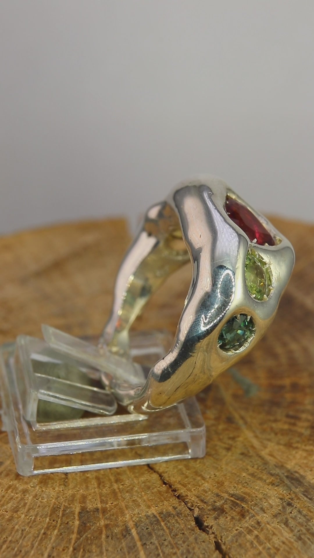 Cinque tormaline di colori diversi — dal verde chiaro al verde profondo, passando per una nota gialla, una sfumatura bluastra e un rosso caldo — sono incastonate come “occhi” nella montatura, ognuna con il suo carattere.